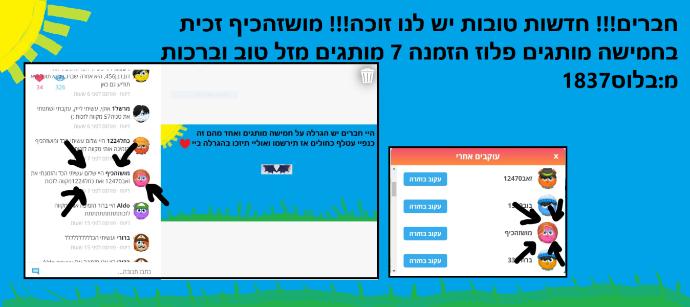 היי חברים כאן בלוס1837 אם חדשות טובות ביותר!!!! מושזהכיף זכת בחמישה מותגים פלוס עוד שתיי מותגים בגלל שהיזמינה את כחל1224 מושזהכיף תיתחדשי בואי אליי לשרת הרה ליער תבואי ביום שני ואני יביא לך את המותגים טוב אז מזל טוב וניתראה ביצירה הבאה ביי אוהבים אתכם בלוס1837,Brownis,וכחל1224 ביי