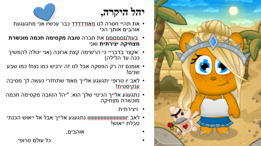 המלאכית האהובה על כולנו מרשמלו... לוקחת הפסקה מטרופי:(((( מרשמלו אני אמחלת לך רק טוב, שאת תחזרי אלינו הכי מהר שיש! שאף פעם לא תשכחי שאת לא רק מלאכית בטרופי! אלא גם מלאכית בנשמה!!!!! אף עפם אל תשכחי שמכל הטרופים שיש צוות טרופי בחר במיוחד דווקא אותך!