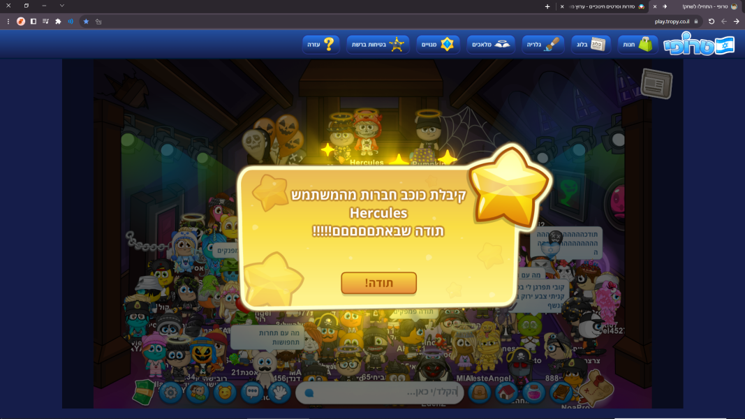 אני רוצה לנצל את ההזדמנות ולומר לכולם שאם פגעתי בכם בדרך כל שהיא בטרופי אני מבקשת סליחה.. לאחרונה אתם באים ואומרים לי שפגעתי בכם ואני לא מבינה מה עשיתי חלק לא רוצים לומר לי ואני מבינה גם למה הכל בסדר יכול להיות שלאחרונה אני קצת עצבנית או מעופפת ולא נעים לפנות אליי או לדבר איתי אבל שתדעו אני באמת לא התכוונתי או אין לי כוונה לפגוע בכם.. התקופה הזאת ממש קשה לי ואולי יצא שהגבתי גם בכעס או בחוסר רצון לענות לכם אבל זה לא נכון להפך אני נהנת ממש לעזור לכם ולהיות איתכם.
