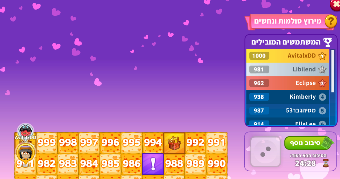 אני היום (ראשון) לא יכולה להטיל את הקובייה קיבלתי 2 פעמים 6 בקובייה אז אוכל לסיים רק ביום שני (מחר).