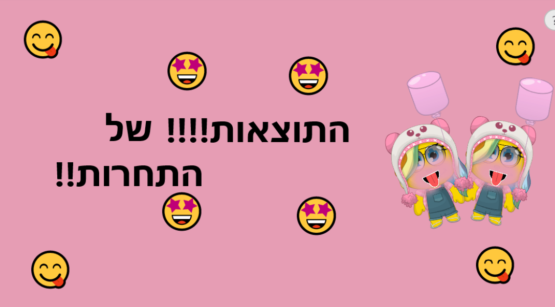 אז כנראה נחתך לי שכתבתי רדו למטההה חחח טוב אני עשיתי ככה: הזוכה בלוק הכיי מפחידד היאאא הוא:: תולנית111 אלופה!! את זוכה בבלון טרופילדת מרשמלו לבן וכוכב! אלופהה הזוכה אם המקום המפחיד ומשפט היאא הואאא:: משמחת! את זוכה במותג 2100 וכוכב :)אלופה!! והזוכה בהעיצוב בשבילי היאאא הואאא:: אוקיי אני יחלק לכמה מקומות כי זה בלתי אפשרי לבחור! אוקי מקום ראשון: תולנית111 את זוכה בחולצת טרופילדת :) מקום שני: משמחת :) אלופהה! את זוכה בכובע יומולדת אלופה! מקום שלישי: צמחוני123 את זוכה בגופית קשת וחולצת טרופי אלופה! אז זהו :) ביי חבריםםם