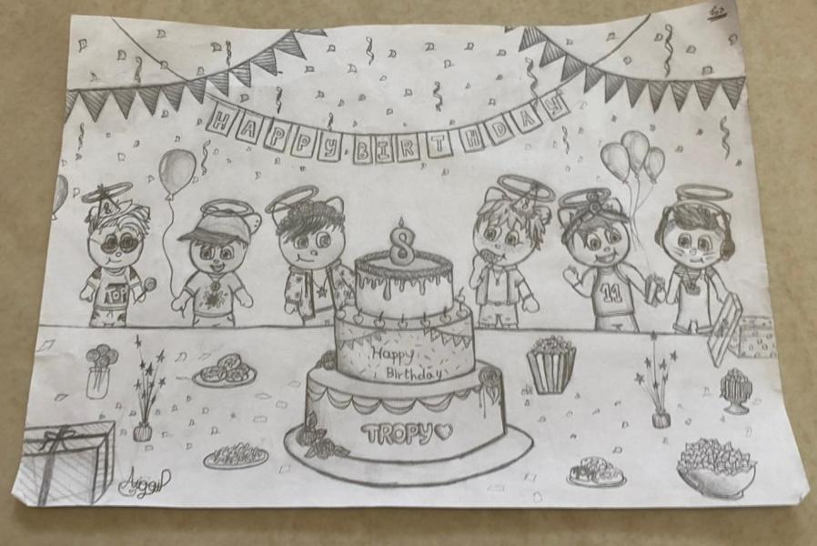בדרך כלל בכל שנה אני אוהב לכלול ביצירה את כל המנהלים, אבל השנה החלטתי לשחזר את היצירה שלי מטרופילדת 4 שבה ציירתי אותי, את זאוס, ואת הרקולס בתור תינוקות בגן והופ גדלנו והנה הגיע יום הולדת 8…