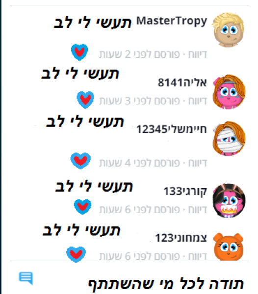 היי מורקים :) זה רעיון לגלריה שמי שאהב את התגובה שלו יכול לעשות לב לתגובה תודה למי שהשתתף: מסטרטרופי, אליה ,חיימשלי,קורגי,צמחוני. ביי מורקים:)