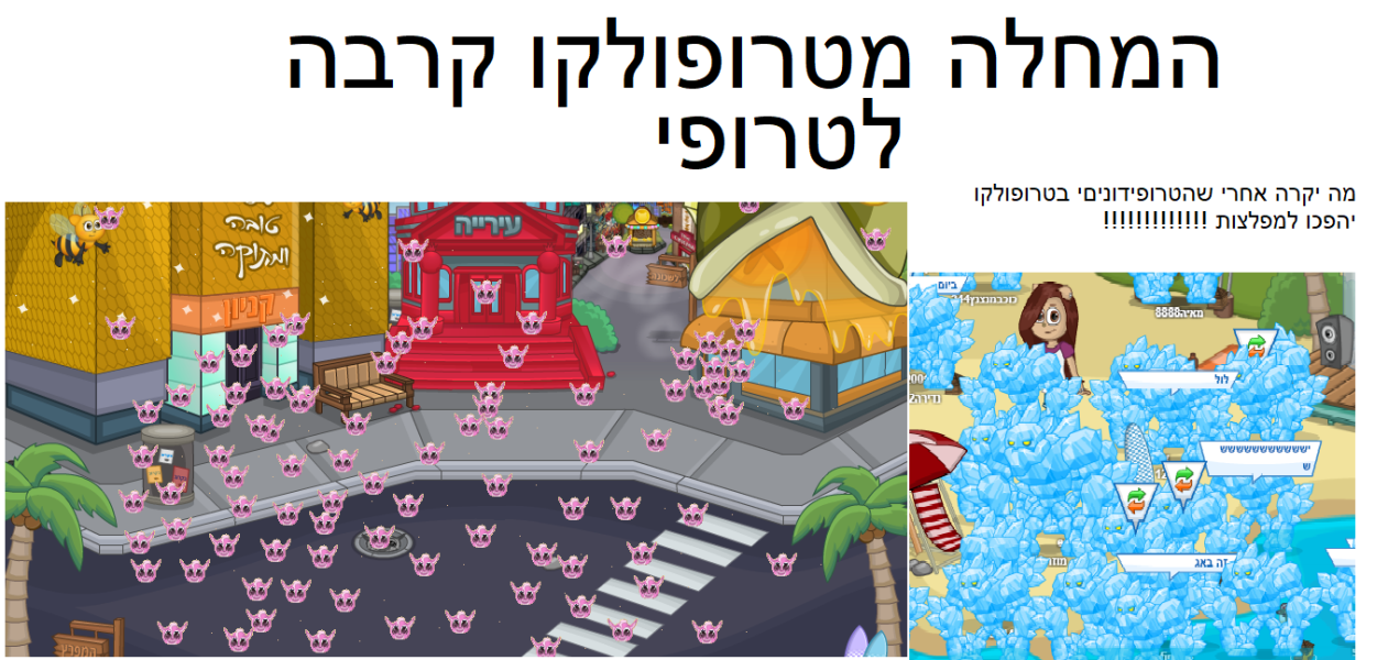 כמו שאתם יודעים על מחלת טרופולקו היא ממש קרבה לטרופי מסתבר שז'אנד עשה את זה והוא רוצה להטיל את זה על טרופי אז כולם שימו מסכות לא להיכנס למקומות טרופולקו והכי חשוב לא להידבק במחלת טרופולקו ממש מסוכן ועוד לכל התלמידים ז'אנד קרב מאוד לטרופי הוא רוצה להשים את הנגיף בטרופי אבל לא נתן לו וראש השנה שמח ולא לשכוח יש עדכון ראש השנה בשעה 16:00 אז לא לשכוח אנחנו הולכים לחגוג תלמידי תפגשו אותי בשעה הזאת